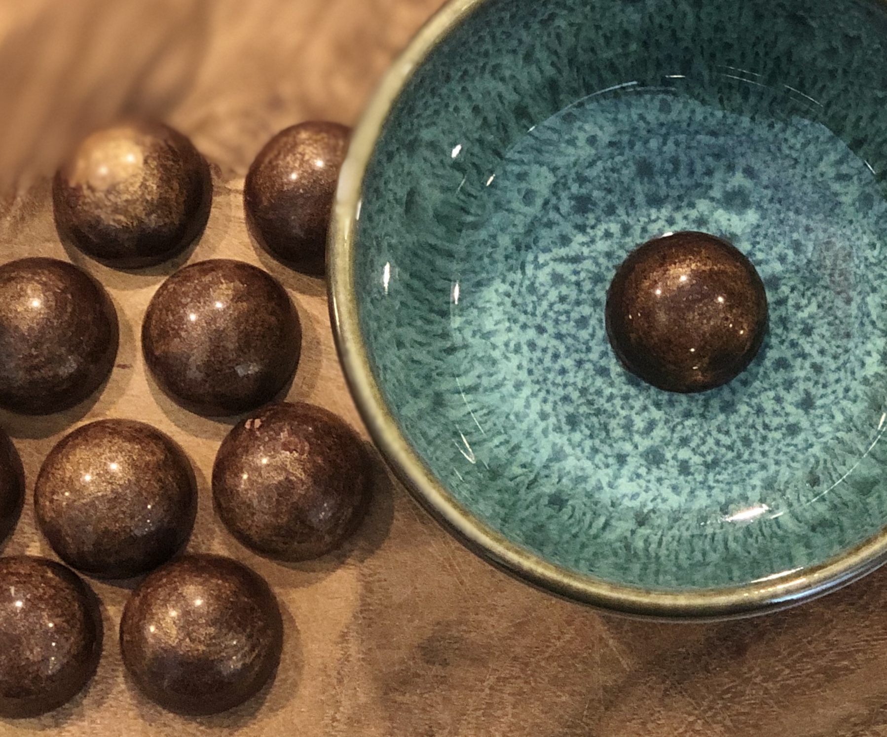 - Hvis du ikke er indehaver af en chokoladeform, er det en mulighed at køle/fryse karamellen for sig, og så overtrække den efterfølgende, men det er lidt en messy affære. Sæt karamellen på køl eller frost i 2-3 timer, tag den ud og brug et par skeer eller fingrene dyppet i vand til at tage karamellen op og forme den, inden den dyppes i den smeltede chokolade. Sæt dem på bagepapir og stil dem tilbage på køl til chokoladen har sat sig.